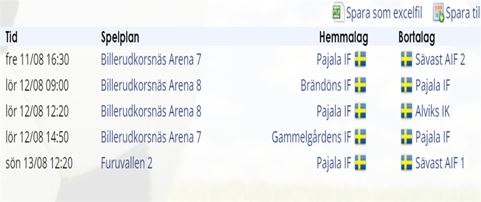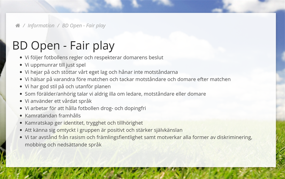 Hej på er! Imorgon är det dags för BD open 2023! Samling inför första match är 15.30 BillerudKorsnäs Nu har jag uppdaterat packlistan och informationsbladet för helgen. Viss ny information finns så kika igenom! Dessa hittar ni under dokument till höger i menyn. Sedan hittar ni en hel del övrig nyttig information på www.bdopen.se kika gärna där också! Här hittar ni matcherna: https://results.cupmanager.net/24033712,2023,sv/team/44169562/matches Supportar- för att förenkla ledarnas arbete med laget under match önskar vi att alla föräldrar och supportar hejar på laget och stöttar oss från andra sidan planen, ej på avbytarbänken eller i anslutning till denna. Detta är viktigare nu när vi ska spela 7-manna och reglerna blir lite andra liksom domarens uppgift också blir lättare vid byten kommunikation med ledare etc. Separat dokument med hålltider för laget kommer inom kort! Hör av er vid eventuella frågor eller funderingar! / Camilla, Hans- Erik, Hector.