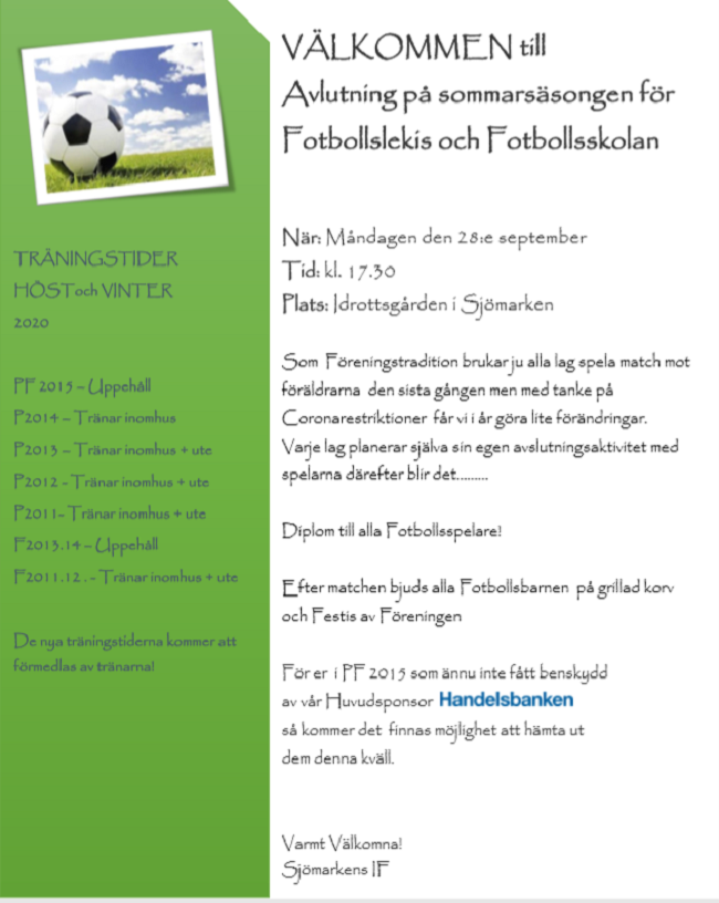 Hej allihopa! Måndag 15 juni är sista träningstillfället innan sommaren. Till detta tillfälle kommer vi även att grilla efter träningen. Föreningen ser till att det finns grill, grillkol och tändvätska. Alla ansvarar för att ta med eget att lägga på grillen. Till detta behövs det även att en föräldrar kan starta upp grillen under tiden som träningen bedrivs. Vi kommer att starta upp träningarna igen i augusti. Mer info om det kommer senare så har gärna ett litet koll på hemsidan under sommaren. Vänliga hälsningar Ledarna F2014 9 jun 2020 0kommentarer