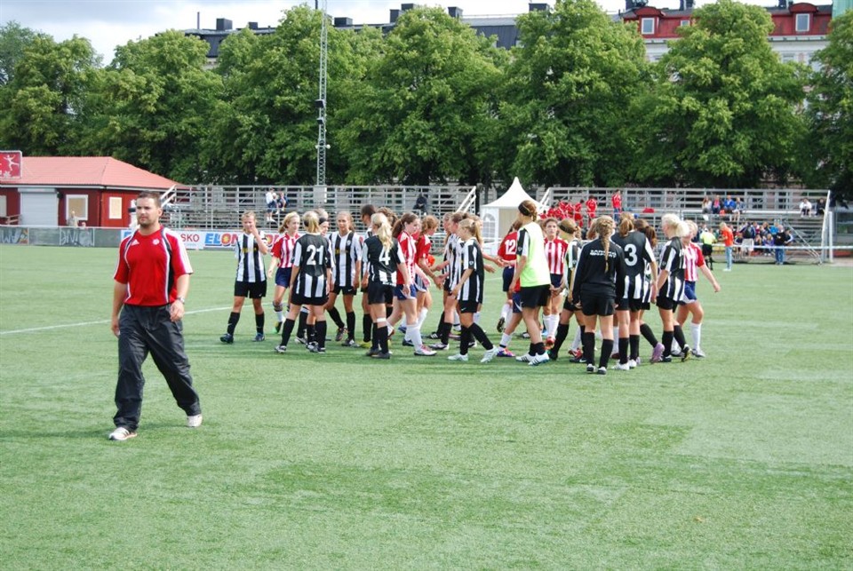 Tidig väckning 6,30. Allt för att tjejerna skall vakna till liv innan matchen kl 9,00. Matchen spelades som bekant på en provisorisk konstgräsplan på Heden. Inte den bästa lösningen. Vi mötte ett amerikanskt lag Roanake från Virginia. Faktiskt ett lag som spelar i seriesystem i Usa. Väder gudarna var med oss i morse. Lite regnfall i början av matchen. Laget vi mötte var ett fysiskt starkt lag. De gick på spelare när de inte hängde med våra snabba spelare. I första halvlek så skapade vi ett stort tryck mot deras mål. Vicky hade en klockren stolpträff efter att hon samlat upp en retur från Jessicas skott. Vi är igenom ett antal gånger och spelet funkar bra. Men bolluslingen vill inte in. De få chanserna motståndarna får skapar vi åt dem genom slarvigt uppspel. Vi får väl skylla de nervösa insatserna på att det är premiärmatch i Gothia Cup. Men motståndarna imponerar inte spelmässigt. De spelar en fysisk fotboll med långa bollar på anfallarna. Vi hade nog förväntat oss att de skulle vara lite mer bollskickliga. I paus handlar det bara om att fortsätta pressa motståndarna. Våga hålla i boll och ta löpningar. I andra halvlek är vi inte med riktigt i inledningen. Nu flyttar motståndarna upp sina positioner. Vi börjar slå långbollar och lite för snabba anfall. Vi vågar inte riktigt hålla i bollen i backlinjen och på mittfältet. Så fort vi vinner boll så sticker vi på anfall. Mittfältet hinner inte riktigt med och vi skapar inte det rejäla trycket. Men chanserna har vi. Johanna har ett hårt skott som går strax över. Victoria nickar strax utanför efter en fin hörna från Linneá. Emma A är igenom ett par gånger men kommer inte riktigt på avslut. Nu bryter Linnéa in från högerkanten och tar sig in i straffområdet. Linnéa slår bollen snett inåt och en av deras spelare styr den i eget mål. Skönt med ledning efter alla dessa matcher och den press vi har haft mot deras mål. Men tyvärr blir vi lite passiva och låter motståndarna ta över matchen. De pressar på bra och 30 sekunder innan matchen är slut agerar vi passivt i försvaret och låter motståndarna göra 1-1. Lite snöpligt med tanke på att det är den ända riktigt farliga målchans de skapar på hela matchen. Vi hade en riktigt bra första halvlek och en lite mindre bra andra. Men nu är vi igång med spelandet. Så vi hoppas nerverna lägger sig i fortsättningen. Nu lägger vi matchen åt handlingarna och tar nya tag imorgon bitti när vi möter aspudden. Vi passade på att fotograferas efter matchen. Sedan spårvagn tillbaka och lunch efter lunch den obligatoriska vilan. Alla sov gott kan jag meddela. Efter vilan så kör vi ett lättare träningspass. Sedan dusch och ombyte för kvällens Gothia invigning. Vi passar på och tackar publiken på plats för allt stödet. Vi ses ikväll för invigningen. Vi ser fram emot ett lika stort stöd imorgon under de två matcherna vi spelar imorgon. Bra spelat tjejer nu kör vi vidare i resterande matcher. Ni där hemma vi hörs lite senare kanske efter invigningen om vi orkar i annat fall imorgon eftermiddag. //Peter F-96 18 jul 2011 0kommentarer