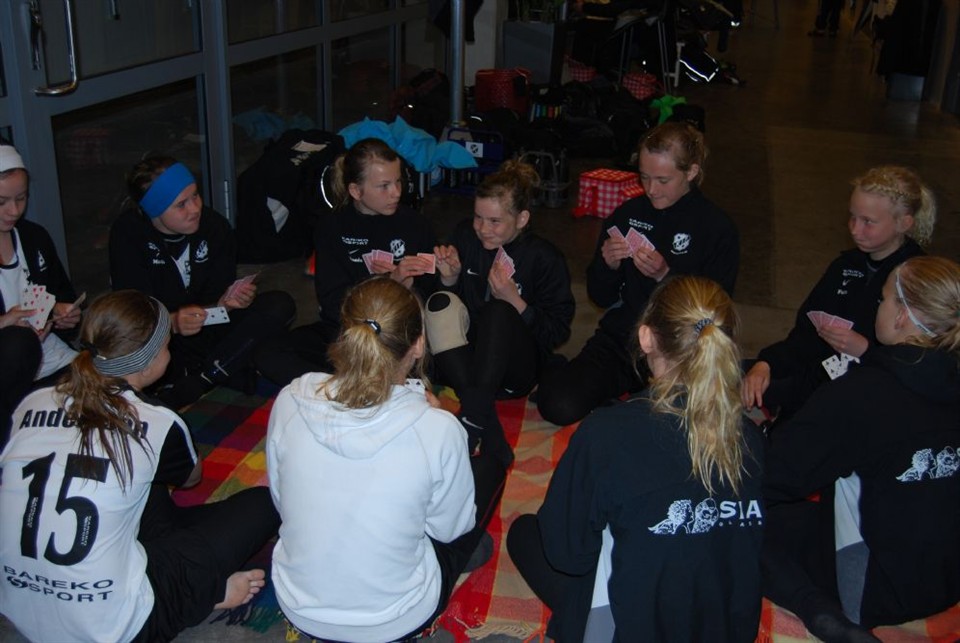 Slutspel Lundacupen. Vi kommer till Lund där regnet står som spön i backen....... vi slår läger direkt i ishallen. Därinne stanna vi tills det var tid för att värma upp. Planen som töserna skulle möta Värtans IK på likna mer en simbassäng, man blir alltid som tränare orolig över ev. skador som kan inträffa med detta underlag. Semifinalen startade med ett rasande tempo från båda lagen och det blev väldigt mycket krigande. Alltid i sådanna här tuffa matcher blir det inte så mycket skönspel. Vi nådde inta alls upp till den standard som vi vet att tjejerna kan prestera, istället blev det stressigt och lite mycket långbollar för båda lagen. Matchbilden kunde tidigt sätt anorlunda ut om Victorias frispark gått in, nu tog bollen precis i ribban.........några cm. lägre så hade vi tagit en ledning. Istället är det motståndarna som tar ledning när vi tappar markering på spelare och de kan göra 1-0. Det var mycket kanande på planen motståndarna trilla ofta utan att vi ens rört vid dem. Mycket onödigt gnäll och skrik från kanten. De tyckte vi var tuffa och vi tyckte precis tvärt om att dom var tuffa och gick hårt in i närkamperna. Där var en situation när Mikaela går på bollen och smäller ihop med en spelare, några steg längre fram är det två motståndare som går på Mikaela så hon blir liggande och tappar andan.Har ikväll varit i kontakt med Mikaelas mamma, de befinner sig på sjukhuste då Mikaela inte mådde bra,hon hade svårt med andningen och det gör ont när hon sitter, hon fick en armbåge i magen när hon vart omkull sprungen. Man har röntgat henne och de väntar nu på svar. Kan nu berätta att Mikaela har tyvärr två brutna revben:( Vi vet att våra töser inte är tuffa utan oftast de som viker ner sig i närkamperna, så dagens händellser får vi nog mycket skylla på regnet och den våta planen. Värtans töser var duktiga, de stod aldrig stilla och var ofta först på bollarna. deras 2-0 mål kom från ett hårt välplacerat skott utifrån. Nu plötsligt blixtrar alla till och plötsligt trycker vi på ordentligt....man kan fråga sig varför man inte gjort detta en kvart innan!!!! Som vanligt lägger Victoria en perfekt hörna & inte helt oväntat gör Felicia mål, ett riktigt snyggt nick mål. De två måste ha någon sorts telepati när hörnan slås. Mtchen slutar med en knapp förlust 2-1. Tre timmars väntan till match om tredje pris.......det blev till att inta ishallen. Där man åt sin medtagna lunch och snackade, Nellie som tagit med sin kortlek kom till användning med en filt på det kalla stengolvet samlades töserna och spelade något som heter Bubblan. Vi pratade nu inför matchen mot Glumslöv att ta det lugnt och prata mycket och hålla igång bollen på ett-två tillslag. Vi visste inte alls hur dessa tjejer spelar på 11-manna. Nu vet vi...de är bra på att finta och dribbla Det var en match där vi mestadels höll oss på deras planhalva, vi fick se mycket bättre passningspel i denna match, dock glömmer vi titta upp och se att bollen levereras till rätt adress. Detta pratade vi om i halvlek och rättade till. I första halvlek på ett pass från Victoria skjuter Felicia direkt och överraskar Glumslöv och där målvakten inte hade en chans att hinna med. Glumslöv fick aldrig något direkt skott på Nellie, de hade två hörnor men utan resultat. de gjorde någon uppstickare på kanten men blev stoppad utav vår duktiga backlinje. I andra halvlek fungerade pasningspelet ännu bättre och och på ett uppspel och ett pass från Emma A så ändrar Victoria resultatet till 2-0. Detta håller sig matchen ut. GRATTIS till Bronsmedaljerna. LÄS HÄR UNDER VAD VÄRTANS IK SKREV OM SEMIFINALEN:) Värtan mötte i semifinal Köpingebro som leder Skåneserien för F14. Köpingsbro är ett tufft spelande lag med flera bollskickliga tjejr. Kanske lite mycket långbollan9e och inte lika mycket spelande som Värtans F96 som (som vanligt) var mindre än motståndarna. Köpingebros passningspel var säkert och till skillnad från Värtans spela så satt passningarna oftast där dom skulle. Men Värtan tar ändå ledningen genom Clara R som dessutom hade ytterligare en boll inne i början av andra halvlek men den dömdes helt korrekt bort för offside. Värtan hade lite problem med de hårt spelande motståndarna och råkade ut för många knuffar i ryggen utan åtgärd samt flera kapningar som var eller oftast inte var "på boll" I mitten av halvleken fick Clara R ytterligare ett läge och satte säkert 2-0.Några minuter senare fick Köpingsbro en hörna som snyggt nickades i mål av en helt fristående anfallare, där får vi lära oss nåt flickor.