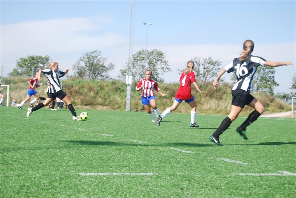 Lunds Bois - Köpingebro IF 2-4 Så var det dags för höstpremiär i strålande solsken.... Nu var det ett tag sedan vi mötte Lunds Bois. Vi har ju stött på varandra en hel del genom åren. Alltid lika trevliga ledare och idag hade de tagit fram det fina vädret åt oss :-) Ja det blev väl som en premiär match skall vara. Lite nerver i början och lite mycket sparka och spring. Vi var tydliga inför denna match att inte drälla med bollen. Lund har duktiga bollvinnare och snabba spelare så de ställer om blixtsnabbt i sina kontringar. Men efter hand som tjejerna börjar rulla boll och hitta sina positioner så ser det stundtals riktigt bra ut. Vi har dessutom en nykomponerad backlinje idag. Så lite nervösare än vanligt för spelarna idag. Dessutom hade vi dragit ner Emma A som offensiv innermittfältare. Men första målet gör Lunds Bois. Efter dålig kommunikation i laget så stjäler en motståndare bollen från Felicia som tror att hon är helt ensam. Spelaren avancerar mellan mittbackarna och sätter bollen snyggt otagbart för Nellie. Men tjejerna ger aldrig upp. Jessica gör ett bra jobb i första halvlek. Hon håller i boll och vinner närkamper. Nu tar de över än mer. I en märklig situation i deras straffområde så vinner Sofia bollen nere vid deras målvakts kortsida bollen. Hon får fram bollen till Hannah LA som stänker upp bollen i nättaket. Ett riktigt kämpa mål starkt jobbat av Sofia. 1-2 till oss är ett riktigt snyggt anfall där motståndarna inte hänger med. Vi vinner bollen på mitten. Emma A får bollen centralt avancerar och går runt på höger kanten. Emma Kommer förbi sin back och slår ett stenhårt inlägg och som ett brev från posten så dyker Hannah LA upp och sitt andra mål för dagen. Ett riktigt klassmål. I paus så pratar vi om att fortsätta våga anfalla och hålla uppe spelet. Vi vet om att deras spelare satsar på långa bollar i medvinden. Dessutom har de riktigt bra inkast i medvinden. Det ser bra ut inledningsvis i spelet. Men tyvärr efter ett misstag igen bjuder vi in Bois i matchen igen. Deras spelare tar tillvara på en hög boll som ingen av våra backar tar hand om. Hon kommer igenom och 2-2 är ett faktum. Lite onödigt med tanke på att de inte skapat några direkta farligheter. Men de får nytt självförtroende och en del frisparkar med sig. Dessutom fick Linnéa sitt första gula kort i karriären (Tror Jag iaf). Men sedan kommer tjejerna igen. De spelar upp sig och skapar en hel del chanser igen. Både Felicia och Jessica har en del chanser. Emma A kommer fram och visar att hon är i form. Emma A avancerar igen på högerkanten. Hon kommer runt sin back och drar ett stenhårt skott i stolpen så att den fortfarande dallrar. Bollen letar sig rakt ut till Antonia som snyggt sätter bollen i mål. Nu känns det som att vi tar över matchen igen. Vi spelar på bra och Emma A får efter allt springande och skjutande göra sitt mål idag också. På ett skott utifrån så sätter hon bollen i mål. En bra genomförd premiärmatch. Lite nervöst inledningsvist. Lite slarviga uppspel och stillastående. Men där skall vara lite att träna på också.... Totalt sett en bra offensivt genomförd match. Några spelare hade en damlags match i benen också med sig idag. Kul att se att Moa Persson (F99) hänger med här också. En klok spelare som vågar hålla i bollen och spela enkelt där det behövs. Så bra spelat tjejer nu kör vi hela hösten. Stjärnor idag * Hannah LA förutom två mål så riktigt bra löpningar för att komma fram och göra sina två mål idag. * Antonia samma sak, tar man inte de löpningarna så är man inte på plats när det gäller. Starkt defensivt spel idag också. Ett mål idag. * Emma A riktigt het idag. Två assist och ett mål. Men alla löpningar finter och vilja idag väger mer. * Mathilda spelade riktigt bra som högerback idag. Tror inte hon haft så mycket speltid som hon hade idag. * Sofia som inte slutar jobba och kan vinna boll ända nere vid målvaktens kortsida och slå den till Hannah som gör mål. **** Fyra mål från mittfälts positioner idag. Bra spelat tjejer nu är vi igång. //Peter Mål och assister 1-1 Hannah Assist Sofia 1-2 Hannah Assist 2-2 2-3 Antonia Assist Emma A 2-4 Emma A assist ? F-96 21 aug 2011 0kommentarer