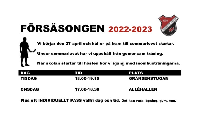 Den 27 april börjar försäsongen inför säsongen 2022-2023. - Vi börjar den 27 april och håller på fram till sommarlovet startar. - Under sommarlovet har vi uppehåll från gemensam träning. - När skolan startar till hösten kör vi igång med inomhusträningarna. TISDAG 18.00-19.15 GRÄNSENSTUGAN ONSDAG 17.00-18.30 ALLÉHALLEN Förutom dessa två pass kör alla ett INDIVIDUELLT PASS valfri dag och tid. Det kan vara löpning, gym, mm. Ni som utövar andra vår/sommaridrotter prioriterar i första hand dem träningarna men är givetvis välkomna att träna försäsong med oss om ni hinner/orkar.