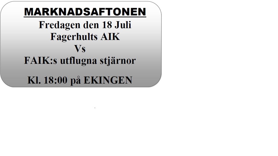 Dags för den årliga marknadsfotbollen vid Ekingen. 18:00 är avsparken och kiosken är öppen! Inträde 20:- Så följ Fagerhults traditionen och ladda upp inför marknaden med lite avkoppling och underhållande fotboll. Välkomna..