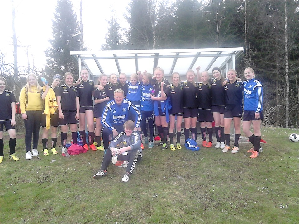 I dag var det match borta mot Åsarp/trädet. Det var långt att åka, men perfekt väder för en fotbollsmatch. När matchen kom igång, så visade det sig att det skulle bli en jämn historia. det var mycket spel på mitten av planen och få målchanser för båda lagen i första halvlek. I andra blev spelet bättre och chanserna kom också. Sigrid hade ett rungande skott i ribban! Några minuter senare. Sköt Alexandra Gustavsson ett hårt skott som målvakten inte kunde hålla och Esther var framme på returen och petade in 1-0!. Härligt. Efter vårt mål fick Åsarp/Trädet upp ångan och stormade på för en reducering. Men vår målvakt storspelade. Men med bara c:a 5 minuter kvar lyckades Åsarp/Trädet få in en boll. 1-1. Då tänkte man nog att det skulle bli slutresultatet. Men våra spelare hade andra planer! I allra sista anfallet slog Alexandra ett snyggt inlägg från sin högerkant som Clara dunkade in med ett mäktigt skott. 2-1 och 20 sekunder kvar. Härligt jobbat. Matchen är inte över förrän slusignalen är blåst. Det visade ni idag tjejer! Och så ska vi naturligtvis ha en lagbild på tjejerna. MB/FIF F02 3 maj 2015 0kommentarer