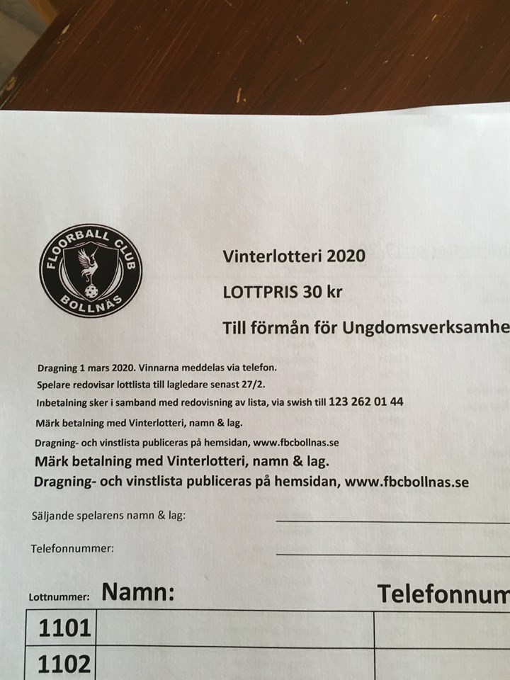 Då är det dags för vinterlotteriet. Lotterna som säljs kostar 30kr st och är till förmån för ungdomsverksamheten. Kommer delas ut i morgon på träningen till alla. De som ej kan närvara i morgon får dom på torsdag eller enlig ök med mig. Kan ni inte på nån träning i veckan så hör av er så löser vi det. Senast torsdag den 27/2 behöver jag ha in lappen med lotterna(10 lotter/lapp), så det är snabba puckar. P-08 17 feb 2020 0kommentarer