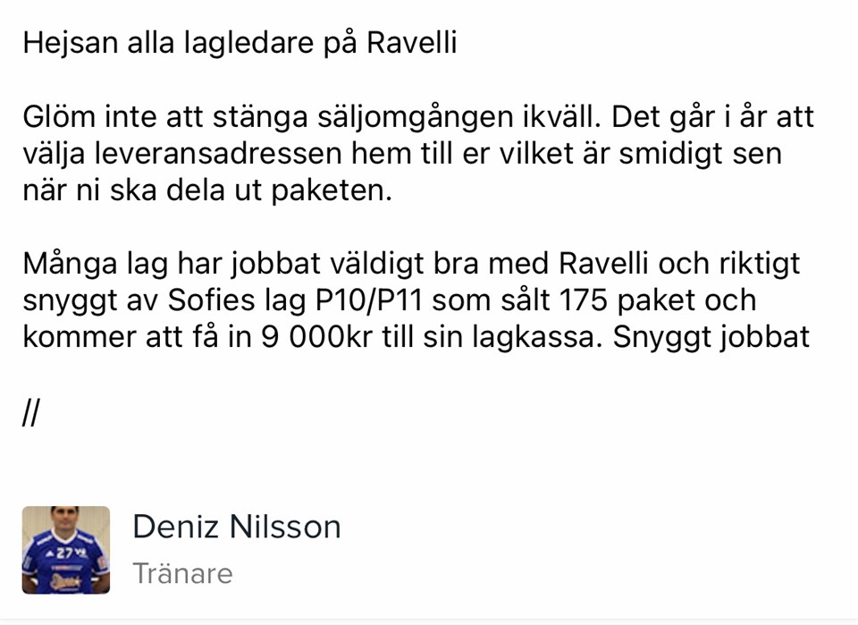 Hej! I fredags avslutades säljomgången för Ravelli, jag återkommer när jag får besked om leverans. Se bifogad bild angående vår förtjänst till laget! 👏 Mvh Sofie P10/11 24 nov 2024 1kommentar