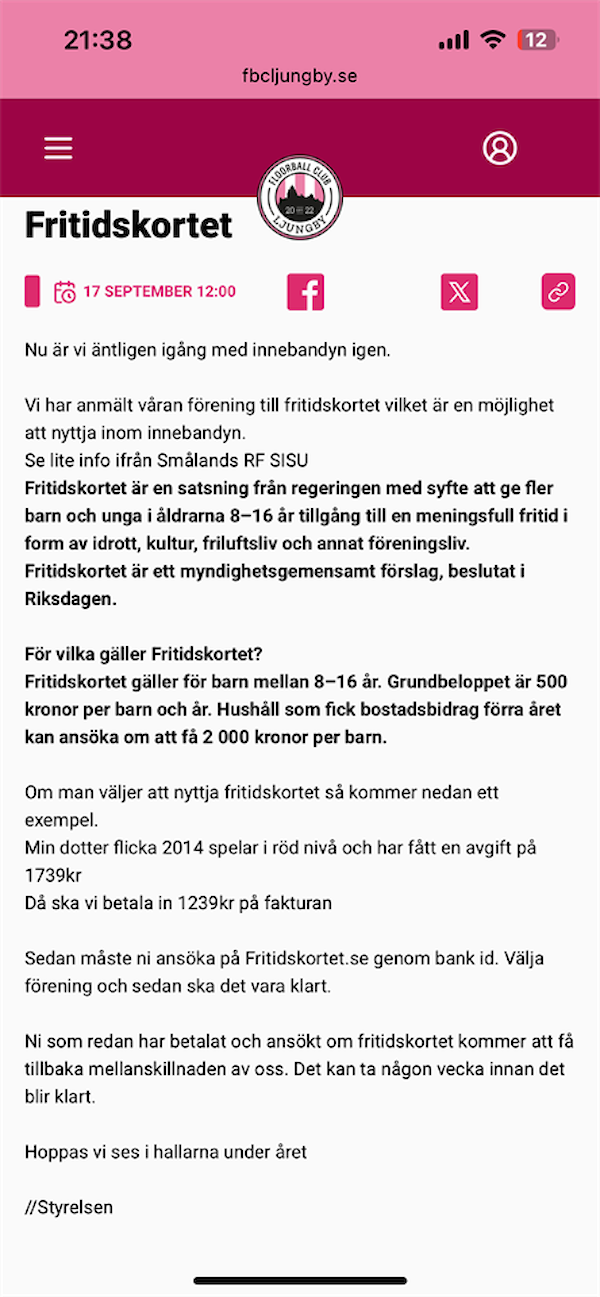 Har fått ett par frågor om Fritidskortet. Här kommer senaste informationen från styrelsen. Se bifogad bild.