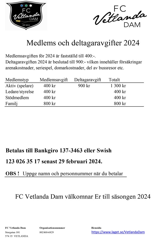 Här bifogas all information gällande medlems- och deltagaravgiften för 2024. Är du en hängiven FC Vetlanda-supporter som bara vill bli stödmedlem? Inga problem, det finns också som ett alternativ. Hjälp oss att bygga en stabil grund för våra lag genom att bli vår stödmedlem!
