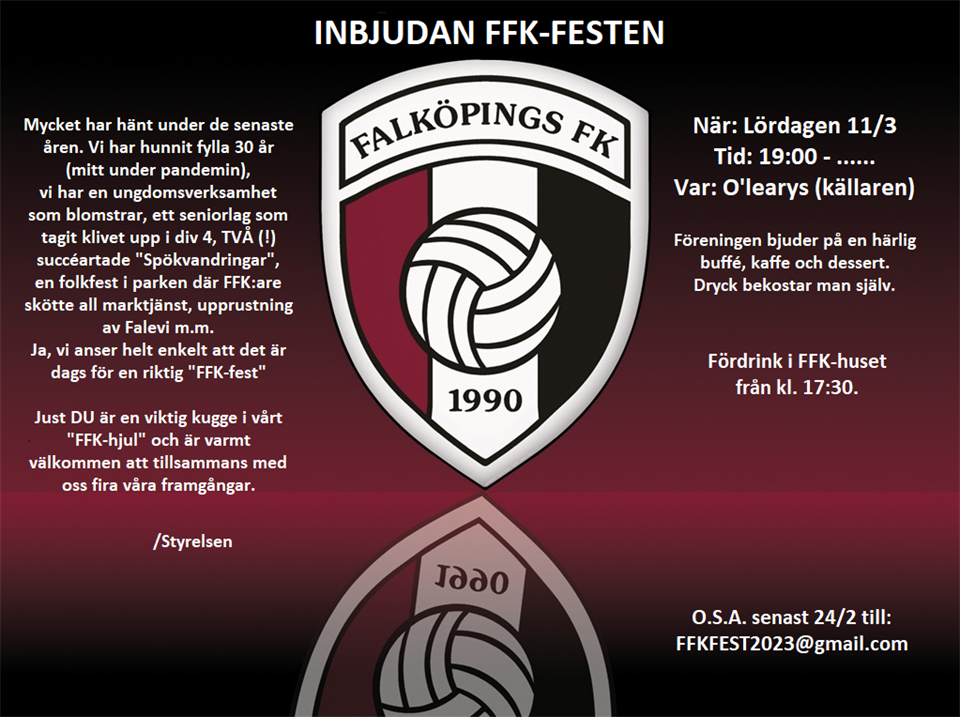 Hej, Ni har fått en inbjudan till FFK-festen. Ett sista anmälningsdatum är 24/2. Vet ni med er att ni skall komma, anmäl er gärna snarast. Det underlättar mycket för vår planering. Ert deltagande mailas enligt inbjudan till: FFKFEST2023@gmail.com Hälsningar Styrelsen Ungdomsledare 9 feb 2023 0kommentarer