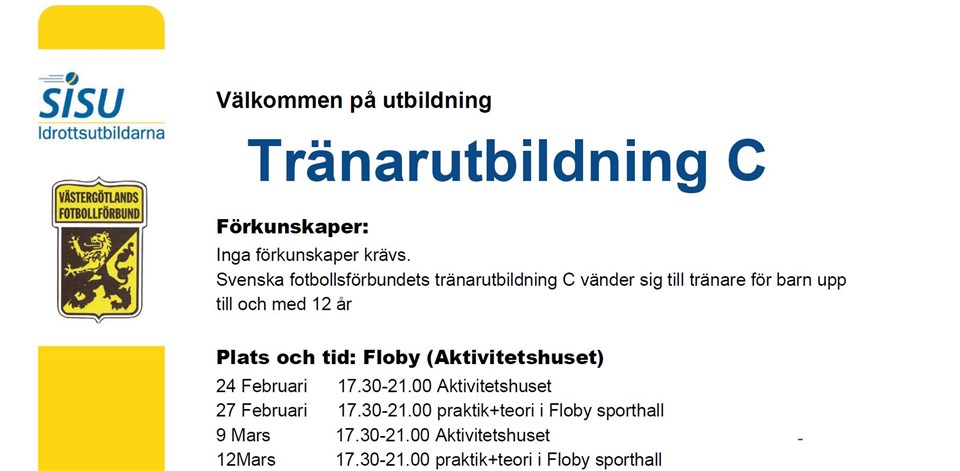 DETTA ÄR INSTÄLLT Nya datum kommer framöver. Dags för C-Diplomutbildning (Svenska fotbollsförbundets tränarutbildning C vänder sig till tränare för barn upp till och med 12 år). Utbildning är vid 4 tillfällen, denna gång i Floby. Se inbjudan för mer info. INBJUDAN TRÄNARUTBILDNING C Anmälan till Morgan på kansliet snarast. Tel: 0515 - 144 30 E-post: falkopingfk@hotmail.com Öppettider: Mån-fre 08:00-12:00