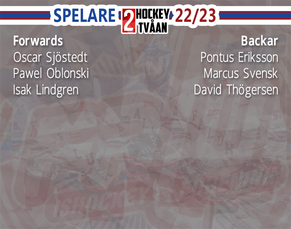 Då har vi fem viktiga förlängningar att presentera! Pawel Oblonski: Pawel går in på sin tredje säsong med FIFen nu och kallas "the Polish beast" av en anledning! På sina 186 cm och 90 kg, är han en spelare man ej vill hamna i närkamp med. En viktig kugge i laget som alltid är positiv och ger allt. Isak Lindgren: Född och fostrad i Falun. Gjorde en sejour i Mora IK under gymnasietiden och spelade ända upp till J20 Nationell. Inför säsongen 20/21 kom han hem igen och var en vass forward i vårt J20-lag, likaså denna säsong. 21/22 blev den första seniorsäsongen, och han växte sig in i rollen ju mer tiden gick! Dessvärre blev våren skadedrabbad för hans del, så mycket matchande försvann då. Marcus Svensk: Mackan är även han född i Falun och uppvuxen här. Hamnade i Mora IK för gymnasiet, men flyttade hem när den tiden var avklarad. Ett fysmonster på 188 cm och 88 kg, som viker sig för få. Gjorde sina första seniormatcher denna säsong och var lysande under denna tid. Blev bara bättre och bättre under årets gång. Pontus Eriksson: Detta blir den åttonde raka säsongen i Falun, varav sjätte på seniornivå. Gick in på över 100 matcher i HockeyTvåan i år, och besitter på mycket erfarenhet. En av de stabilaste backar Falun haft på länge. När han är ute på isen vet man att grovjobbet görs fullt ut! David Thögersen: Den mest rutinerade back i laget. Flyttade till Falun 2012 för gymnasietiden, och var en nyckelspelare i juniorlagen på denna tid. Gick upp med Malung till HockeyEttan 17/18 och hann med en hel säsong där, innan flyttlasset gick tillbaka till Falun inför 19/20. Fick tyvärr en väldigt skadedrabbad säsong, efter att en smäll tog dåligt i premiärmatchen mot Hedemora föregående säsong. Går in på sitt nionde år i seniorhockey!