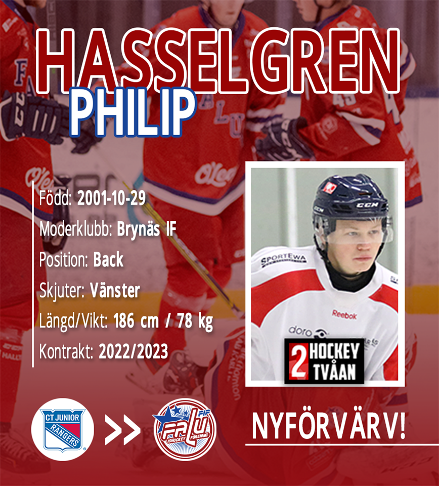 Nästa spelare att presenteras är ännu en hemvändare! Det är ingen mindre än den spelskicklige backen Philip Hasselgren som återvänder till Falun. Philip var en viktig spelare både för både J20 och seniorlaget under sitt sista år hos oss. Då stod han för 31 poäng på 54 matcher (sett överlag). Sedan bar av mot Huddinge IK inför säsongen 2020-2021, även om den sejouren blev kortvarig. För det blev en flytt till USA samma säsong! Där blev det spel med Connecticut Jr. Rangers i NCDC, fram tills nu. Hur går tankarna kring att vara tillbaka i Falun? - Det känns otroligt kul och spännande! När Tomas Jonsson ringde så blev jag genast intresserad, med tanke på hur bra det gick för laget förra året. Det känns som föreningen har något bra på gång. Det har blivit över ett år i USA nu! Hur sammanfattar du tiden? - Första säsongen blev väldigt försenad på grund av corona, så det blev en ganska kort visit där borta. Andra säsongen blev mycket bättre, även fast vi inte gick så långt som hoppats. Men det var en bra upplevelse! Känner att jag har utvecklat mitt spel på flera nivåer. Förra säsongen blev det kval till HockeyEttan för FIFen, även om det inte räckte hela vägen! Bidrar det lite till Faluflytten? - Det gjorde det definitivt. Det känns som att klubben har utvecklats varje år sedan jag sist var i föreningen, och jag tror vi kan nå hela vägen denna gång. Om du får beskriva dig själv som spelare, hur låter det då? - Jag skulle säga att jag är en tvåvägsback och väldigt stabil bakåt. Är heller inte rädd att offra mig för laget. Samtidigt hänger jag gärna med upp i anfallen när jag får chansen. Välkommen tillbaka Philip!