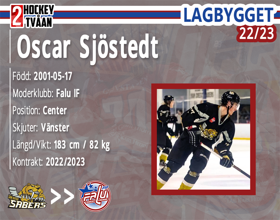 Det är med glädje som vi nu kan presentera säsongens första nyförvärv. Välkommen hem Oscar Sjöstedt! Förra säsongen blev det spel med Gislaved i HockeyTvåan. Dessutom på andra sidan Atlanten med San Diego Sabers som håller hus i USPHL Premier. Det är en stabil forward vi får i Oscar Sjöstedt, med stort utvecklingspotential! Med Falu IF som moderklubb, var det alltså sju säsonger sedan denna klippa spelade i vår förening. För sex säsonger sedan testade han vingarna i Leksand där han spelade med både U16 och J18. Gymnasievalet landade därefter på Östersund, och under det tredje året fick han äran att ta på sig kaptensbindeln i sitt J20. Med detta lag producerade han 26 poäng på 52 matcher över åren, men sista året gav ett poängsnitt på 1.17! Nu blir det alltså en återkomst i Falun för dig! Hur känns det? - Det känns grymt kul och spännande att komma tillbaka hem efter att varit borta i sju säsonger. Vad fick dig att hamna här? - Jag tror Falu IF har något bra på gång och är en förening med ett tydligt mål att ta sig uppåt i seriesystemet. Därför kändes det som en självklarhet att vända hemåt - för att få representera moderklubben. Förra säsongen spelade du både i Gislaved och San Diego. Hur hamnade du på andra sidan Atlanten mitt i allt? - Det var faktiskt en vän från tiden i Leksand som hörde av sig och frågade om jag var sugen på att prova hockeyn i USA. Filip Plars som har spelat där borta under hela gångna säsongen var han som hörde av sig! Då kände jag direkt att det var en chans som jag inte fick gå miste om. Vad kan man förvänta sig av dig som spelare? - En stabil tvåvägscenter som gillar att vara med och bidra i offensiven med min spelförståelse. Men prioriterar även spelet i den defensiva zonen. Förväntningar på den kommande säsongen? - Det ska bli grymt kul att dra igång! Jag hoppas på en säsong där vi som lag bara blir bättre och bättre, och är som bäst när det gäller som mest.