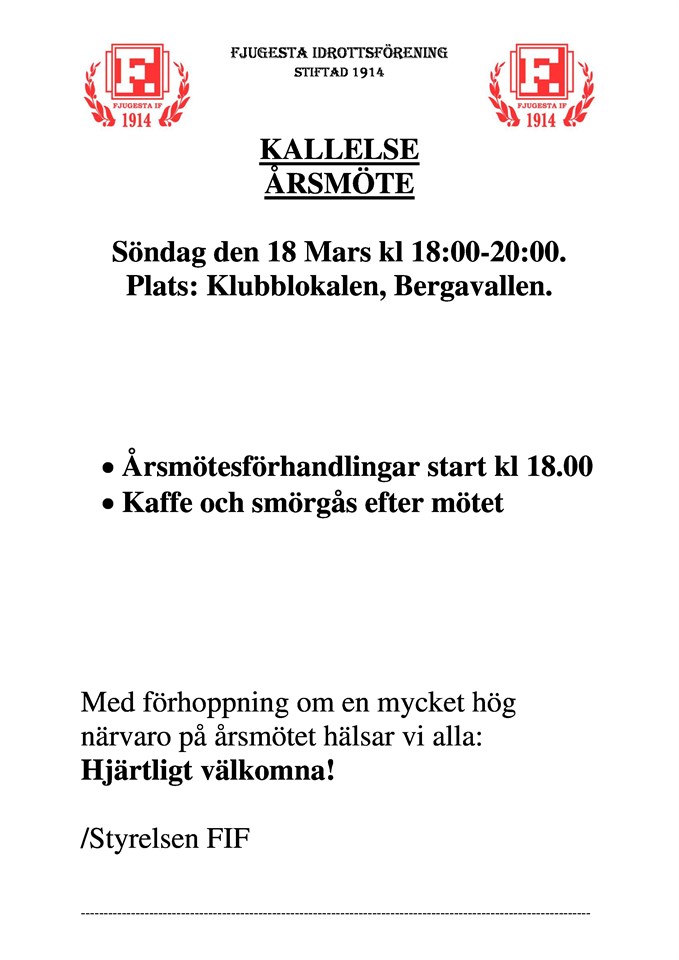 Mars månad innebär sedvanligt årsmöte. Söndag den 18 Mars kl 18:00-20:00. Plats: Klubblokalen, Bergavallen. Årsmötesförhandlingar start kl 18.00 Kaffe och smörgås efter mötet Med förhoppning om en mycket hög närvaro på årsmötet hälsar vi alla: Hjärtligt välkomna! /Styrelsen FIF