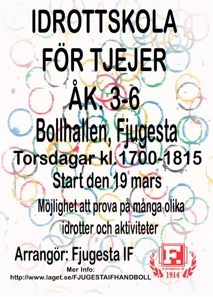 Hej! Fjugesta IF startar nu upp Idrottsskola för tjejer i åldern 9-12år. Vi kommer köra olika sporter varje gång. Med inriktning på bollsporter. Men vi har även ambition att göra lite andra saker. Första tillfället är torsdag 19 mars kl. 17:00-18:15 i Bollhallen Fjugesta. Hoppas du har möjlighet att vara med! Ansvarigar för Idrottsskolan är Mats Jacobsson och Ted Isudde. Vi ses! Ted Isudde 0707285516 ted.isudde@gmail.com Fjugesta IF 11 mar 2015 0kommentarer