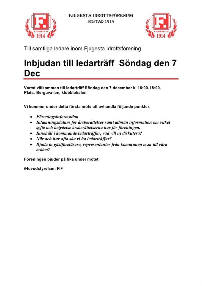 Söndag den 7 December så är samtliga ledare inom FIF varmt välkomna till en ledarträff på Bergavallen. Mer info finner ni i inbjudan. Fjugesta IF 5 nov 2014 0kommentarer