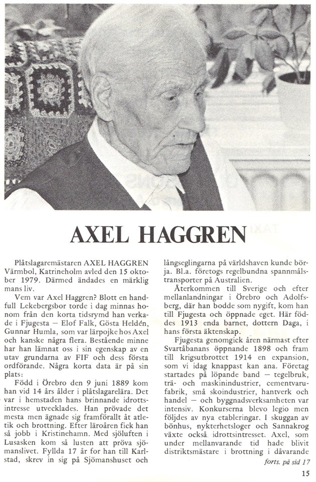 Det är ingen vanlig dag idag. För exakt 100 år sedan, den 2 Februari på Fjugesta Hotell inne på rum nr 5 så togs beslutet att grunda en idrottsförening som har överlevt två världskrig bl.a. Första världskriget bröt ju faktiskt ut samma år som FIF grundades. Ett helt sekel har sedan dess passerat revy i föreningens historia! Idag tror eller rättare sagt så är vi tämligen säkra på att personen som har fått personifiera grundandet utav föreningen, nämligen Axel Haggren sitter och ler lite extra brett just idag tillsammans med våra svunna eldsjälar och trotjänare däruppe på "hyllan". Gissa om det kommer att bli kalas ikväll. Nu drogs ju inte maskineriet igång på egen hand utav Axel utan det fanns ju flera inblandade i det hela som inte ska glömmas bort. Axel kommer dock alltid att förknippas med FIF och dess grundande i egenskap utav föreningens första ordförande. Med anledning utav föreningens officiella födelsedag så vill vi inte bara hylla en vital och livaktig förening som än idag består. Vi sänder även våra tankar till Axel och hans kamrater som drog igång alltihop och även alla de personer som har bidragit till föreningens minst sagt långa och innehållsrika historia. Hur det kommer att se ut om hundra år har vi ingen aning om och det lär inte min generation få veta heller men vi är ett tappert gäng som gör vårat bästa för att driva föreningen framåt och personligen skulle jag känna mig hedrad om jag fick dela sittplatsen bredvid Axel uppe på "hyllan" om hundra år och titta ner på en förening i ständig utveckling men som samtidigt bejakar sin värdegrund. Det är inte många som vet vem denna mytomspunne Axel Haggren är eller vad han gjorde så vi passar på att bjuda på en artikel ur FIF:s klubbtidning I Vitt och Rött nr 1 1980. Artikeln är signerad Bengt Ekelund och där får ni er en liten uppfattning om vem Axel var. (Ni som läser detta på hemsidan får kika under fliken Bilder för att hitta artikeln.) Samtidigt gör vi väl precis som fotbollsherrarna gör efter en victoria, vi utbringar ett fyrfaldigt leve för 100-åringen! Hipp,hipp; HURRA,HURRA,HURRA,HURRAAAA!! Signerat, Christian Nilsson