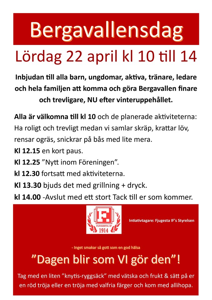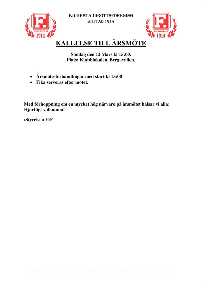 Vi i Fjugesta IF kallar till ett möte för att diskutera internt och komma med ett förslag, ett färdigt och gemensamt förslag till Bokningsmötet med Lekebergs kommun i början av juni. #1 Måndagen den 23 maj, klockan 18.00 till 19.00 Plats: Bergavallen, klubblokalen. #2 Samt den 25 maj, klockan 18.30 till 19.30 -för att lägga till tider som tillkommit efter mötet den 23 maj. Det vill säga, välja tid och hall för det som är tillgängligt efter mötet den 23 maj! Frågor, fram till den 24 maj, kan mailas till info@fjugestaif.se med rubriken: Tidbokning 2022-2023. OBSERVERA: Endast frågor kan besvaras. EJ bokningar! Agenda: -Vi utgår från föregående tider och därefter komma med förslag och diskutera fram tider som vi sektioner, lag och aktiva vill boka. Kallande för Huvudstyrelsens räkning och mötets moderator: Göran Bäckström, (nås till och med 24 maj på 0729-447 154). OBSERVERA: Endast frågor kan besvaras. EJ bokningar! Med vänlig hälsning FIF Huvudstyrelse