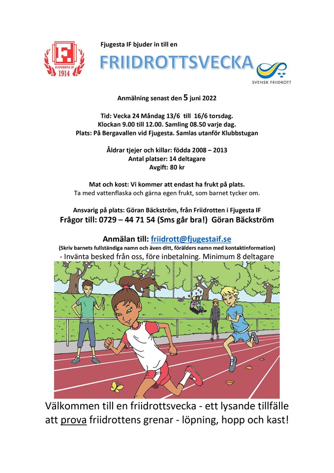Se hit alla tjejer och killar fördda 2008-2013! Nu finns det möjlighet att anmäla sig till FIF:s friidrottsvecka som äger rum vecka 24, 13-16 Juni.