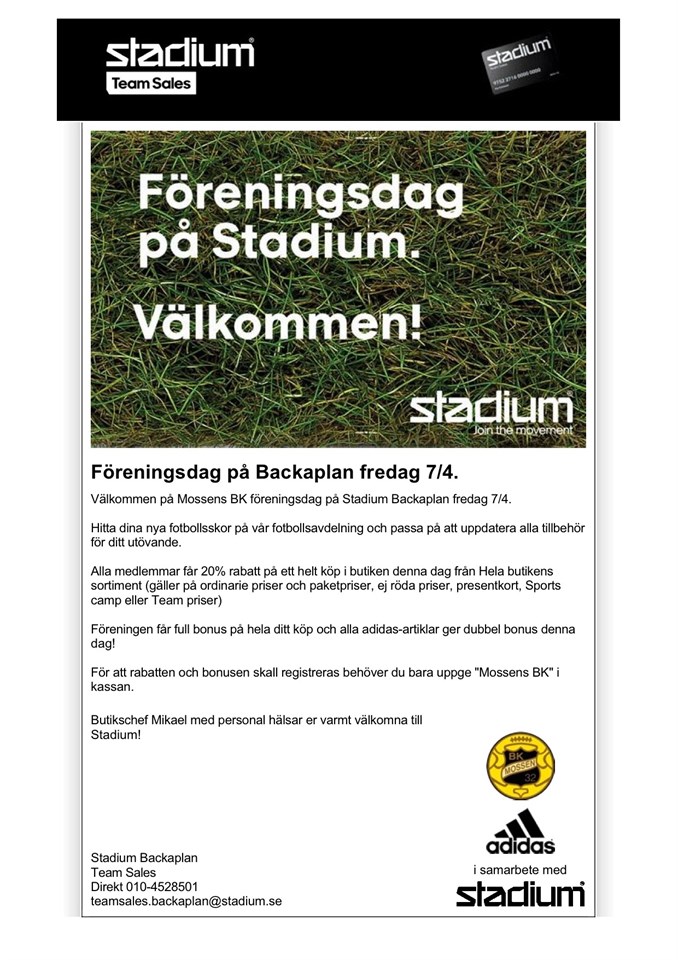 Välkommen på Mossens BKs föreningsdag på Stadium Backaplan fredag 7/4. Hitta dina nya fotbollsskor på vår fotbollsavdelning och passa på att uppdatera alla tillbehör för ditt utövande. Alla medlemmar får 20% rabatt på ett helt köp i butiken denna dag från Hela butikens sortiment (gäller på ordinarie priser och paketpriser, ej röda priser, presentkort, Sports camp eller Team priser) Föreningen får full bonus på hela ditt köp och alla adidas-artiklar ger dubbel bonus denna dag! För att rabatten och bonusen skall registreras behöver du bara uppge "Mossens BK" i kassan. Butikschef Mikael med personal hälsar er varmt välkomna till Stadium! FotbollsKul 6 apr 2017 0kommentarer