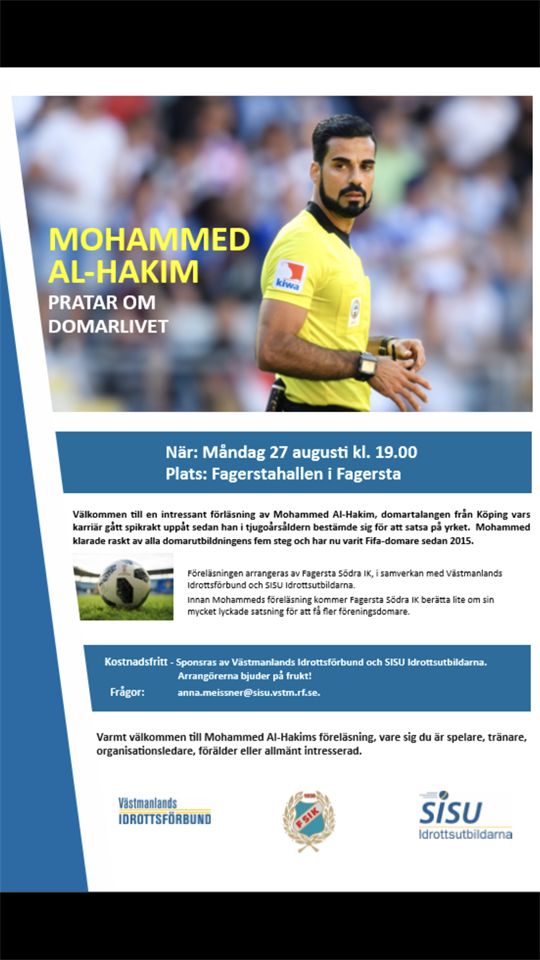 Gratis domarföreläsning där Fagersta Södra IK är arrangör. Domarföreläsning måndag 27 augusti 19.00. Plats Fagerstahallen. Genom samarbete med SISU och Västmanlands idrottsförbund kan Fagersta Södra IK bjuda in till en gratis föreläsning av domaren Mohammed AL-Hakim. Detta gäller alla som är intresserade, från spelare, förälder, medlemmar eller till kommuninvånare. Från 17.30-19.00 så gäller det alla föreningsdomare inom Fagersta Södra IK. Kom och lyssna 😊 Extraträning 21 aug 2018 0kommentarer