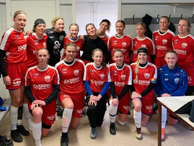 Just nu får man vara glad för varje minut fotboll vi får spela och stundtals bjöd vi denna söndag på bra rull och spelglädje - något som gav oss segern med 6-1 mot div 4-laget Häverödals SK. De yttre förutsättningarna var verkligen ingen höjdare, under uppvärmningen blåste målet ned mot skyddsnätet och "kvadratspelet" blev en ständig jakt på nya bollar då de drog iväg ovanligt långt så fort de lämnade spelytan. Kul då att vi trots motvind kan inleda matchen med bra press på våra motståndare och ett par tidiga mål, varav det andra är en riktig pärla utifrån av startdebutant Hanna Davidsson. Häverödal sätter sedan sin bonusstraff men utöver ett avslut strax innanför straffområdet där Mathilda sträcker ut fint och räddar så gör vi försvarsjobbet på bästa sätt och förhindrar farligheter från Häverödalshåll. Istället kan vi med ytterligare tre mål gå till halvtidsvila med ledning 5-1, flera mål med grund i ett lyckat presspel och aggressivitet i och kring straffområdet. Överlag kul att se hur vi försöker rulla nerifrån, med flera lyckade spelvändningar i främst backlinjen, men även ett par lyckade sådana via mittfältare i spelyta 1. De är tuffa att tas med centralt, men vi tar oss då istället desto oftare runt på våra kanter och vi är i alla fall under första halvleken ett steg tydligare och mer beslutsamma sista tredjedelen! BRA! I början av andra gör vi lite byten och totalt under halvleken kommer fem nya lirare in vilket såklart påverkar rytm och roller på planen - men framförallt ser HSK ut att tagga till lite extra så vi skapar inte riktigt lika många absoluta målchanser i andra halvleken. Vi blir lite omständliga i och kring straffområdet, men självklart kan vi också konstatera att medvind inte direkt gjorde det lättare att lira då djupledsbollarna ofta rann ifrån och många inspel från kant hamnade i målvaktens famn istället för närmare den straffpunkt vi hade velat ha dem mot. Vi får lite korta spelavstånd och lyckas inte riktigt tajma löpningarna offensivt vilket gör att vi landar lite felvända och stillastående - men defensivt fortsätter vi ta jobbet på ett bra sätt och låter inte Häverödal producera mer än någon hörna. Vi kan istället själva göra 6-1 när Nina efter en hörna kan förvalta andrabollen med en bra halvvolleyträff som målvakten inte orkar hålla. Åter en riktigt bra laginsats över 90 minuter. Vi vågar rulla boll hela vägen nerifrån och vi kommer till fler avslut än våra motståndare. En homogen och pluskantad insats trots svåra yttre förutsättningar och ett något svagare motstånd än de senaste två fighterna. Kul att se de nya spelare som får speltid idag och tar för sig (ex ett bra inhopp från Ebba Jansson som spelar bolltryggt på högerbacken!) och de övriga som gör sina årsdebuter eller startdebuter. Kollektivet gör det bra och samtliga gör bra saker som bidrar till segern och att ta med sig till kommande fighter, men extraplussen idag till mittbacksparet Joss o Jojo som sprider trygghet i uppspelsfas och i försvarsspelet samt till Jess som gör stor skillnad centralt med sitt tvåvägsspel. Nästa helg väntar Upplands Ekeby/Oland för ett "Films SK 2" (där de som fått minst speltid hittills matchar i första hand) innan vi helgen efter avslutar gruppspelet i Upplandscupen med match mot ett väntat starkt Gimo - seriekollega i div 3. OM vi inte har andra förutsättningar då utifrån Coronaspridningen etc. - men det är vår plan. Keep up the good work!!