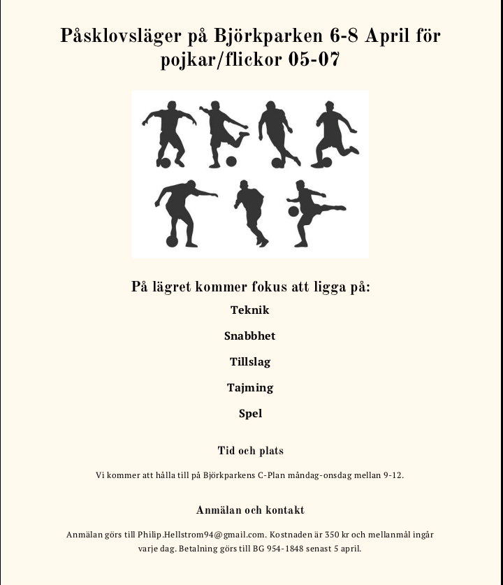Passa på att anmäla er till påsklovsläger på Björkparken i Film med vår herrlagsspelare Philip Hellström! Vi följer Upplands Fotbollsförbunds riktlinjer kring Corona för vår verksamhet. F-2007 Futsal 26 mar 2020 0kommentarer