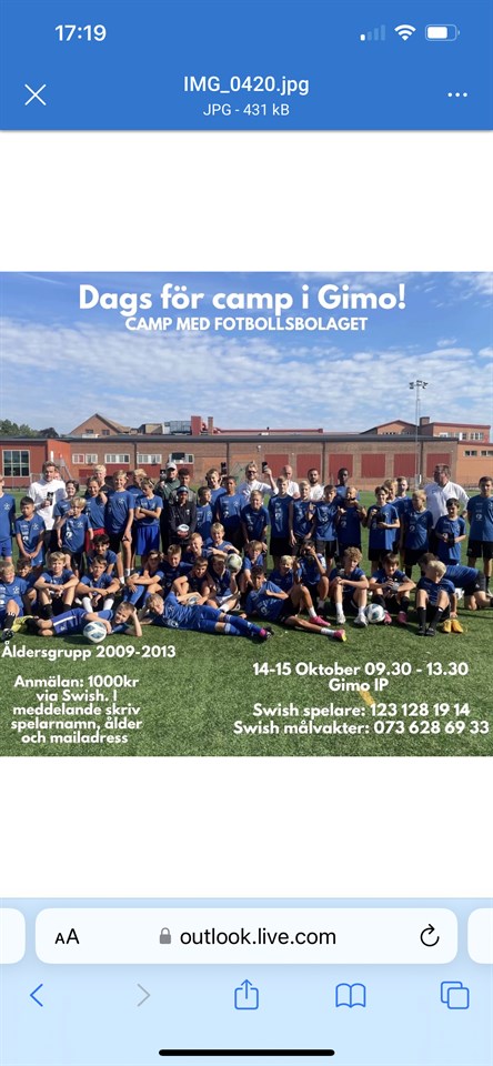 Hej! Vi fick info om en kommande fotbollscamp i Gimo den 14-15 oktober som anordnas av Fotbollsbolaget som haft liknande läger där tidigare år. Målgruppen är killar och tjejer födda mellan 2009-2013, både utespelare och målvakter. Mer info om Fotbollsbolaget hittar ni här: www.fotbollsbolaget.se Ni kan även maila Pontus Johansson ( pontus.johansson33@gmail.com ) Ett bra tillfälle att få lira lite extra fotboll när säsongen närmar sig slutet och ett bra tillfälle att få träffa lite nya kompisar mm Se mer info på den bifogade bilden. IFK D/Ö F-2013 13 sep 2023 0kommentarer
