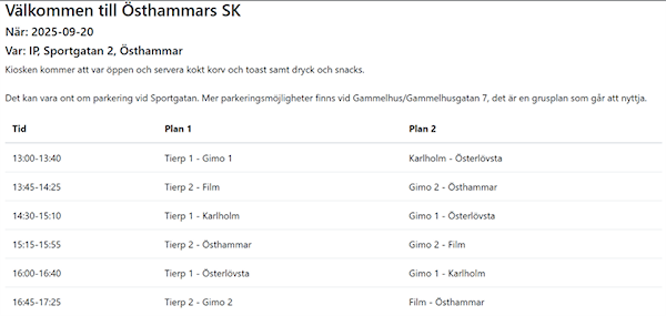 Samling på IP för ombyte 12.00 och alla byter om där efter sista matchen för att samla ihop kläder.