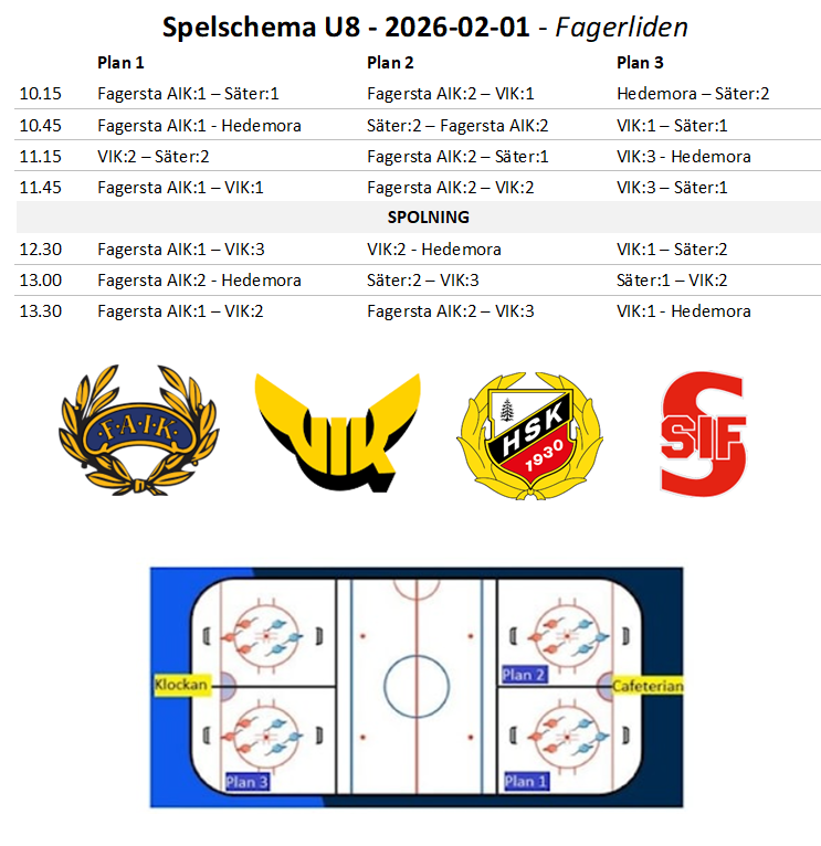 Bifogar söndagens spelschema Samling kl 09.15 Följande lagindelning: FAIK:1 Jens, Johan V, Martin (Gula) Kajsa, Leia, Liam, Måns, Frej Målvakt: Sigge, August FAIK:2 Mattias, Dennis (Svarta) Albin, Alfred, Collin, Clara, Doris Målvakt: Wilma, Ellis Förbereda på isen: Samuel, Tobias G + övriga på plats Sekretariat: Ingemar, Lisa V, (Camilla) Cafeterian: 9.30-11.45 Malin K, Peter, Magnus 11.45-14.00 Jessica, Johan L, Nicklas L