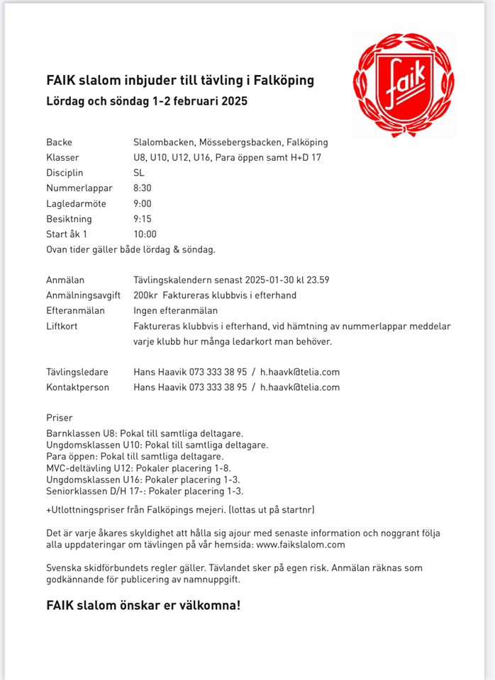 Godkväll! Imorgon börja våran hemma tävlingshelg i Slalom Nedan tider är det som gäller för kommande dagar. Nummerlappar kl 08.30 Besiktning kl 09.15 Första start kl 10.00 Vi tränare kommer att finnas i backen från kl 07.30 för att förbereda inför tävlingen. Vi kommer alla att besiktiga banan ihop. Jag har bifogat inbjudan för tävlingen till inlägget. Hälsningar Daniel U12 31 jan 0kommentarer
