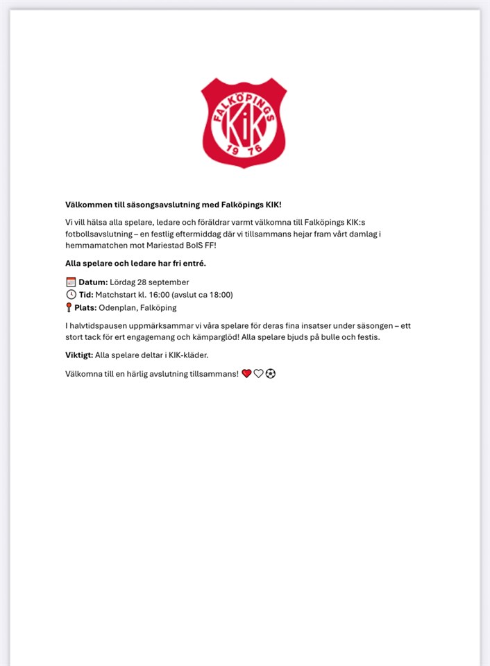 Klicka på bekräftelselänken i det mejl vi skickat dig för att börja ta emot uppdateringar från Falköpings KIK F 12 (Födda -13).