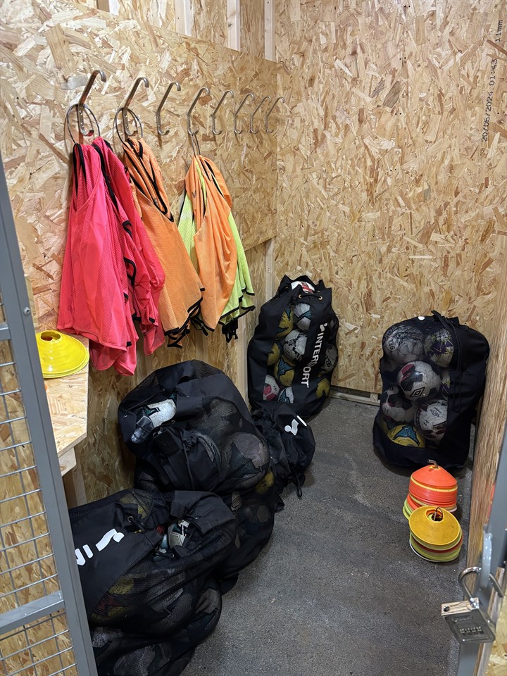 Nu finns det både bollar, koner och västar uppe vid förrådet i ishallen.