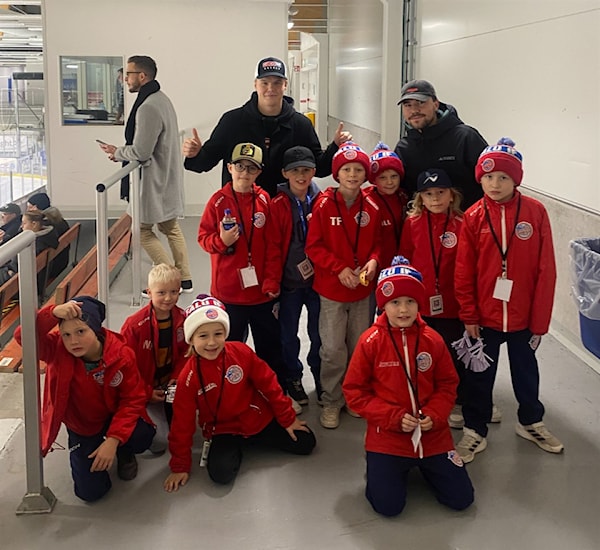 Förutom att sälja massor med lotter har barnen varit på jakt efter medlemmarna i Bolaget som var på plats i ishallen och delade ut pris till matchens bästa spelare. I andra perioden hittade barnen äntligen Bolaget och det fick vi såklart med på bild 😊