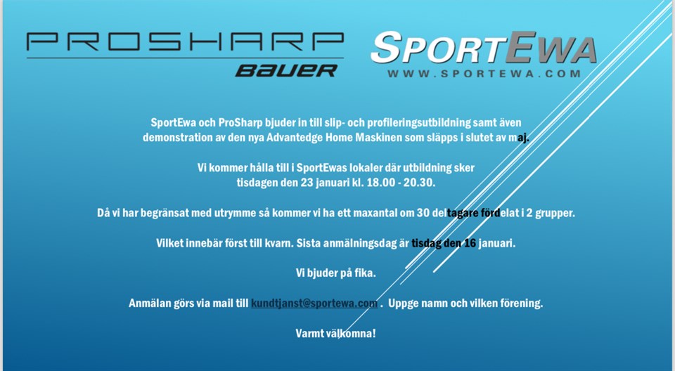 Hej på er 😃. Tisdag 23 januari kommer det att hållas en sliputbildning ute hos SportEwa kl 18:00-20:30, se även bifogat dokument. Denna utbildning riktar sig till er som verkligen vill vara med hjälpa till med slipning av skridskor till laget 😃. Anmälan görs till kunstjanst@sportewa.com Uppge namn och vilken förening/lagtillhörighet. Mvh Fredrik