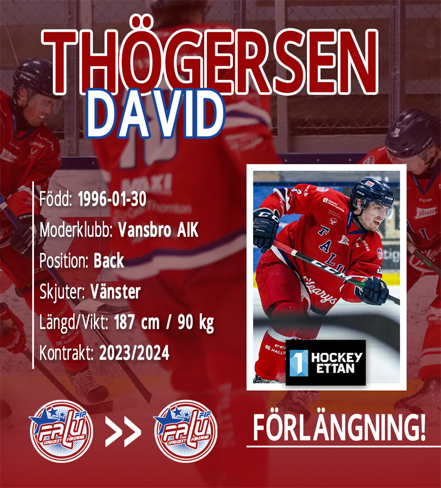 Då var det påskrivet och klart! Tunga backen David Thögersen spelar fortsatt i Falu IF över säsongen 23/24. Denna herre går nu in på sin sjunde säsong i Falutröjan, och besitter totalt åtta säsonger i Division 2 samt en säsong i Hockeyettan. Under årens lopp har han spelat i både Leksand och Malung utöver Falun! Detta är en trotjänare utan dess like. Med sitt uppoffrande och trygga spel är vi givetvis väldigt glada i att kunna landa denna förlängning - ett viktigt adderande till backsidan! A-lag Herrar 3 maj 2023 0kommentarer