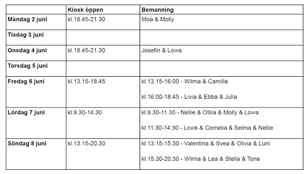 Nu har jag gjort ett nytt kioskschema för v.23. För att vi ska få ihop det kommer några av er att få stå två pass även i detta schema. Behöver ni byta pass så får ni själva försöka lösa det med varandra.