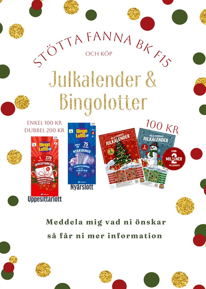 Då är vi i gång med försäljningen av julkalendrar och bingolotter för uppesittarkväll och nyårsafton. Det finns både enkel- och dubbellotter.