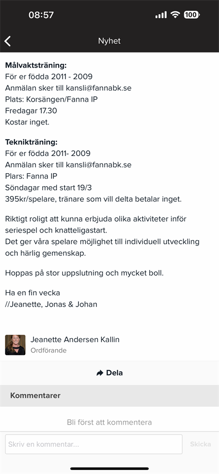 Hej, F om denna vecka är de nya träningstider. V10-v18. Tisdag kl 19-20.30 fanna ip. Torsdagar 19-20.30 korsängsfältet. Då kommer vi starta med löpning och lite konditionsträning så alla tar med sig utegympaskor. Vi kommer samlas 10 min innan så alla hinner snacka av sig och knyta dojorna. Vi måste tänka på att de kan bli snabba avbokningar av träningar om de blir snö eller är för kallt. Redan nu i morgon är de inställt pga snö. Men som de ser ut nu är de träning på torsdag återkommer om de blir ändringar. Therese Per och Anders. P/U 16-17 6 mar 2023 0kommentarer