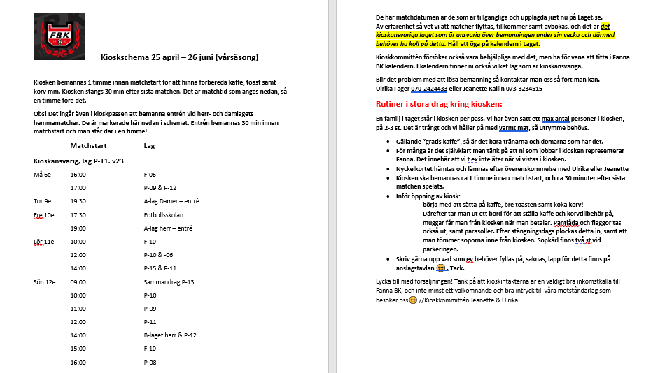 Hej! Hoppas alla är redo för sitt kioskpass nästa vecka. Vi har två ändringar matchschema, nu på måndag är första match redan 15 så bra om ni kan vara på plats strax inna det. Sön blir det förlängt en timme på kvällen men då är jag där så det löser vi. Lite praktiskt att tänka på: *Jag ser till att mån gänget kommer in, sedan finns det ett kort i kiosken som ni lämnar till nästa på listan så alla kommer in på sitt pass. * Viktigt att ni står minst 2 i kiosken för att hinna med * Endast kycklingkorv på grillen (lite efterfrågan så lägg inte på mer än Max 2 åt gången) * Tränare får gratiskaffe * Domare får något drickbart o något att äta (korv, toast, fikabit - ej godis) - en per dag/inte per match Ring mig om ni har några frågor eller om något strular. Lycka till! //Ulrika –———— Hej! Vecka 23 är det dags för P-11 att bemanna kiosken på Fanna IP. Schema enligt nedan. Ni får komma överens med övriga i ert pass om ni väljer att dela upp passet. Tiderna nedan visar bemanning; 1 h innan matchstart samt 30 min efter sista match. Det är också två A-lagsmatcher den veckan och då ska vi även stå och ta entre; 30 min innan och man står 1 h. Nyckelkort ser jag till att lämna till första passet och sedan får ni själva se till att någon på nästa pass på listan får kortet. Måndag 6/6 15:00-19:00 Aston, Eltjon & Max Torsdag 9/6 18:30-21:30 (+entre) Milton, Linus & Hiyab Fredag 10/6 17:00-21:00 (+entre) Oscar, Sune & Abdi Lördag 11/6 09:00-12:30 Sixten & Sebastian B 12:30-16:00 Kevin & Isak Söndag 12/6 09:00-13:00 Arvid, Finan & Philip 13:00-18:00 Timothy, Mohammed & Pontus Hör av er om ni har några frågor och ni kan alltid ringa mig om det uppstår något i kiosken som ni undrar över. Hälsningar Ulrika, 070-2424433