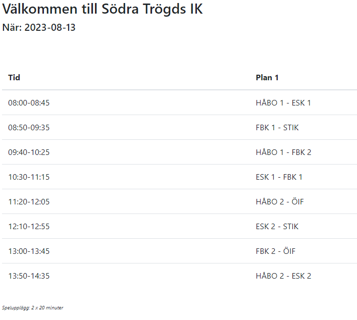 Hej Pga regnet så flyttas matcherna imorgon till konstgräsplanen i Lillkyrka. Detta medför att vi kommer att spela färre matcher då vi bara har en plan att nyttja. Vi är glada att cupen i huvudtaget kan genomföras så killarna får spela lite fotboll. Bifogar det nya schemat. Vi samlas samma tid kl 8:00. Första matchen spelas kl 8:50. Vilket lag man tillhör kommer att meddelas imorgon