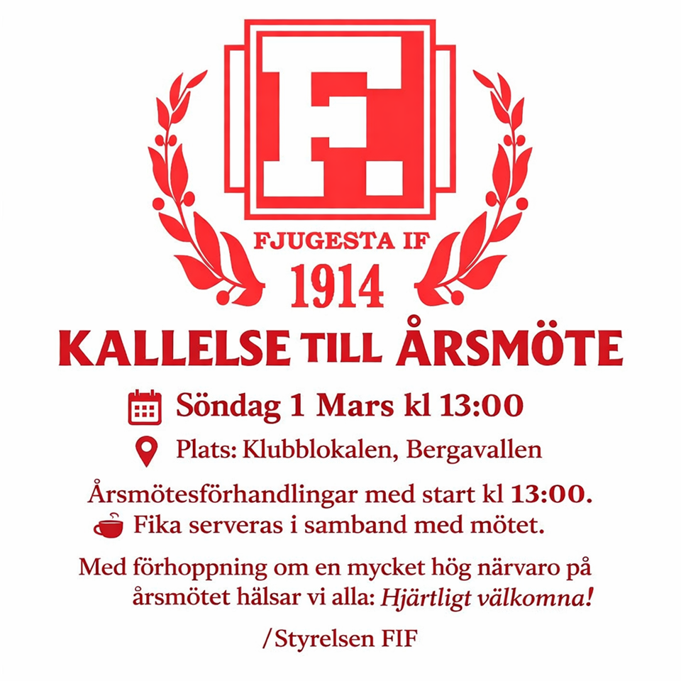 📣 Kallelse till årsmöte! Varmt välkomna till föreningens 112:e årsmöte i ordningen! Söndag 1 mars Kl. 13:00 Klubblokalen, Bergavallen Årsmötesförhandlingarna startar kl. 13:00 och självklart bjuder vi på fika! Din chans som medlem att vara med och påverka föreningens framtid! Vill man lämna in en motion så ska den vara inskickad senast den 8 februari till info@fjugestaif.se /Styrelsen FIF
