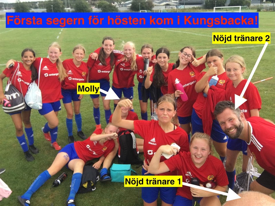 En tidig revelj och en bit att åka och därför sa Jimmy under uppladdningen att vi ska inte ha allt detta bestyr i onödan, vi ska åka hem och känna oss nöjda med vår insats, vinst eller förlust men vi ska känna att vi gjort jobbet. Anders (jag) plussade på med att vi kanske har en tokig ramsa som nästan bygger på att vi ska vara lite loja i starten och tappa taget för att sedan komma igen. Vi kom överens om att de nio som startade skulle vara rejält på hugget och att de som var vid sidan om skulle bevaka spelet för att vara så förberedda som möjligt vid byten. Vi kom att bli mycket nöjda med dessa önskningar! Thea fick starta på mittfältet och var rivig värre (det är hon iofs alltid). Kompromisslös i närkamper och snabb i steget gav hon oss 1-0. Moa satte sedan 2-0 (mål nr ett av fyra denna dag!) och Alice satte 3-0, fast det visade sig vara dömt offside vilket kanske de flesta inte tyckte, men 3-0 blev det lite senare genom Moa. Kungsbacka kom att utnyttja vår akilleshäl: hörnor. En hård boll mot främsta stolpen och inte så beslutsamma aleiter fick hacka i sig en reducering. Nära där efter i tid skapade KBA en vass dubbelchans men Svea fredade målet, viktigt (Molly stod i första). Men istället för 2-3 blev det 1-4 sedan Elsa med vänster fot och fint samspel med flera röda tjejer gjorde ett härligt mål. 2-4 tillkom efter en situation där vi på kanten, men framförallt backlinjen, tyckte var en klar offside. Molly var sedan nära att göra mål direkt på avspark, hade det varit medvind istället för motvind så: kaschiiiing. I den sista perioden serverade Asli en fin boll till Moa och 5-2 och samma tös satte sitt fjärde mål och förde oss fram till 6-2-ledning. 3-6 blev det efter en fin frispark från KBA som var otagbar för Nelly (tack för att du accepterade ditt öde, en tränares kommando och sätter laget före jaget!). Det sista målet som gjordes i matchen skrivs upp på Svea, 7-3 och en klar seger. Därtill fin inställning och många riktigt bra sekvenser i passningsspelet. Vi har tjatat lite om att få fler bollar på yta och det lyckades tjejerna bra med, trots att planen var något mindre än vad vi är vana vid. Vi tackar chaufförer för er tid, er sponsring av drivmedel och stöd under matchen. Tack Kungsbacka för ett trevligt bemötande från alla som vi stötte på och grattis till hemmalaget som kan ha sådana gräsmattor att spela på. Stor avundsjuka från oss i torra Halmstad. Nästa matcher är tis 6/9 och lör 10/9, båda hemma. Nu hoppas vi på tre bra träningspass veckan som kommer.