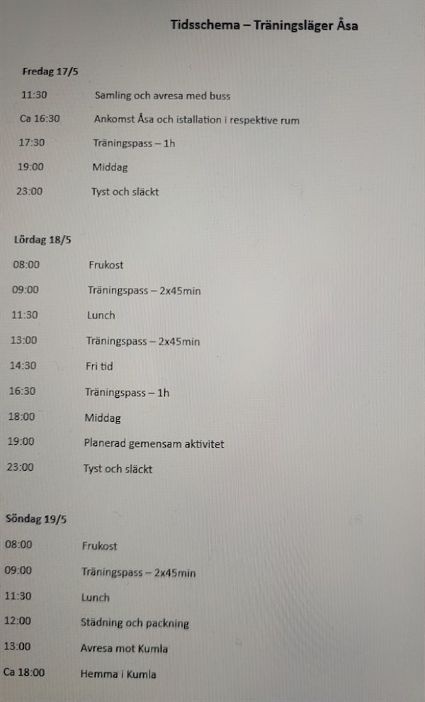 Nästa fredag är det dags för vårt träningsläger. Bifogat finner ni vårt schema för dagarna i Åsa.