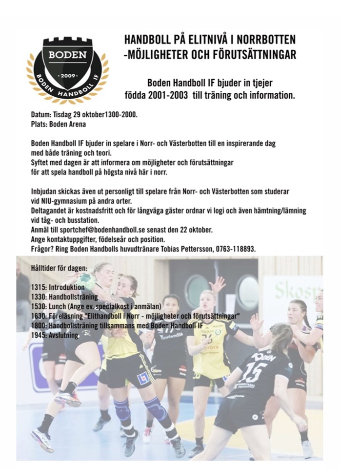 För information till samtliga klubbar. Boden Handboll IF bjuder in tjejer födda 200-2003 i Norr- och Västerbotten till en inspirerande dag med både träning och teori. Syftet med dagen är att informera om möjligheter och förutsättningar för att spela handboll på högsta nivå här i norr. Inbjudan skickas även ut personligt till spelare från Norr- och Västerbotten som studerar vid NIU-gymnasium på andra orter. Deltagandet är kostnadsfritt och för långväga gäster ordnar vi logi och även hämtning/lämning vid tåg- och busstation. F 03 8 okt 2019 0kommentarer