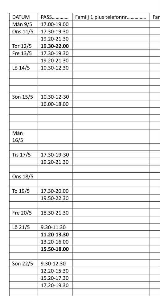 Hej! Nu är det P-13s tur att ha hand om kiosken v 19 och 20. Varje pass är mellan 2 och 3 timmar och behöver tillsättas med två personer (två familjer). Det är sammanlagt 40 pass, så det är 1-2 pass per familj i laget. I den bifogade bilden kan ni se vilka pass det gäller, titta där och mejla de tider ni önskar till marcusangervall@hotmail.com samt namn och kontaktuppgift så sätter jag ihop ett schema. OBS! SENAST FREDAG, 6/5, så tiderna kan mejlas ut och luckor kan ordnas. Ju fler tider ni anger ju lättare blir det att sätta ihop. Hör av er om ni undrar något! Mitt nummer är 0709-828640 Mvh Marcus Angervall Filen/bilden nedan är uppdaterad med rätt datum. Hör av er till Marcus för att lösa planeringen på bästa sätt. M