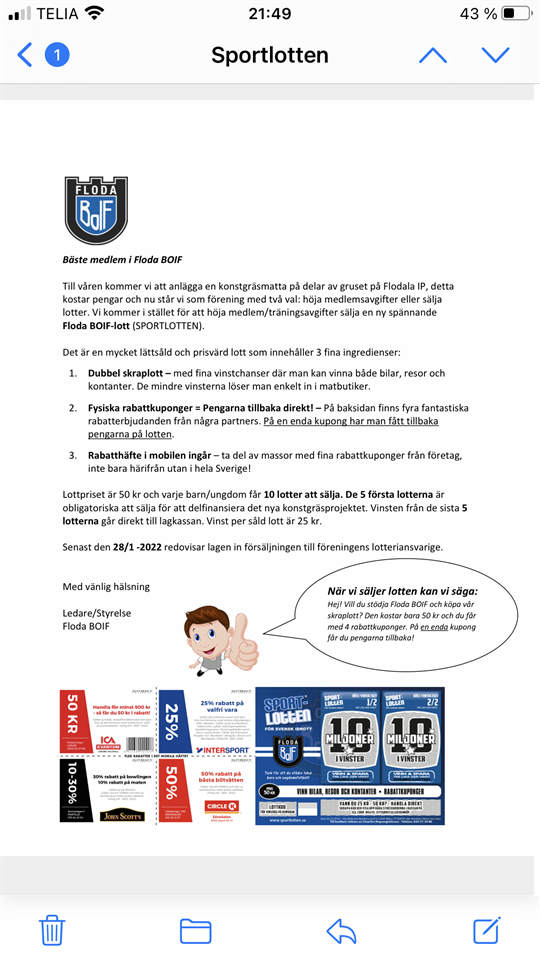 Här kommer info från klubben ang lotterna. Glöm inte att hämta ut lotterna på onsdag, se tidigare nyhet! Med vänlig hälsning, Ledarna P14