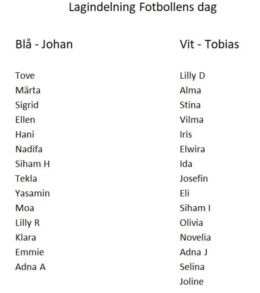 Hej. Här kommer en preliminär lagindelning inför fotbollens dag. Detta kan ändras utifrån om någon blir sjuk t.ex.