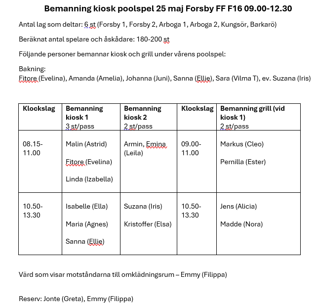 Hej på er! Vi har nu äntligen fått klart gällande antal lag på vårt poolspel. 6 st lag deltar på vårt poolspel! (Forsby 1 , Forsby 2, Arboga 1, Arboga 2, Kungsör och Barkarö) Kul tycker vi! Kul även att så många redan nu vill ställa upp med både bemanning av kiosk, grill och bakning inför arrangemanget! Det kommer att vara litet mellanrum mellan matcherna och tjejerna kommer att spela totalt 3 matcher. När vi räknade på uppskattat antal deltagare, insåg vi att det förhoppningsvis kommer att komma närmare 200 personer. För att inte det ska vara ett alldeles för stort tryck på kiosken, är vi inne på att ställa upp ytterligare en kiosk. Dvs två kiosker med samma utbud varav en också har grill. Det gör att vi skulle behöva ha ytterligare två föräldrar/pass i kiosken utan grill. Tiderna är 08.15-11.00 och 10.50-13.30 ca. (Poolspelet slutar strax efter 12, men vi behöver hjälpas åt att plocka undan) Har vi några frivilliga som ännu inte anmält sig för att stå i kiosken men kan tänka sig att göra det? Skriv då gärna i kommentaren och meddela även ditt barns namn samt vilket pass du kan ta. (Vill man hellre grilla, kan vi säkert göra rockader däremellan också.) Det kommer en tydlig översynsbild av kioskbemanningen inom kort. Tacksam för snabb återkoppling och ha en fortsatt bra dag! Ledarna FFF F16