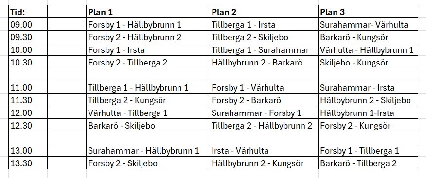 Äntligen! Säsongens första poolspel på hemmaplan! Samling kl. 08.00 vid omklädningsrummen Lagindelning: Lag 1: (John och Angelica) Agnes, Ella, Ellie, Greta, Ikhlas, Izabella, Juni, Ninnie, Nora, Vilma, Wilma Lag 2: (Robert och Alice) Astrid, Diana, Ellen, Emilia, Eptisam, Evelina, Iris, Mollie, Rifadi, Riyana, Sophie Spelschema: Se bild Medtag fotbollsskor, matchkläder, benskydd och ett glatt fotbollshumör! Vi önskar att vi alla hjälps åt med att i positiv anda heja på det egna laget, motståndarna och våra unga domare så att vi får en fin, trevlig fotbollsupplevelse tillsammans! Ibland blir det kanske inte riktigt som man tänkt sig, det har vi som vanligt full förståelse för. Därför önskar vi att ni snarast meddelar om ni får förhinder som gör att ni inte kan delta på poolspelet. /Ledarna F16